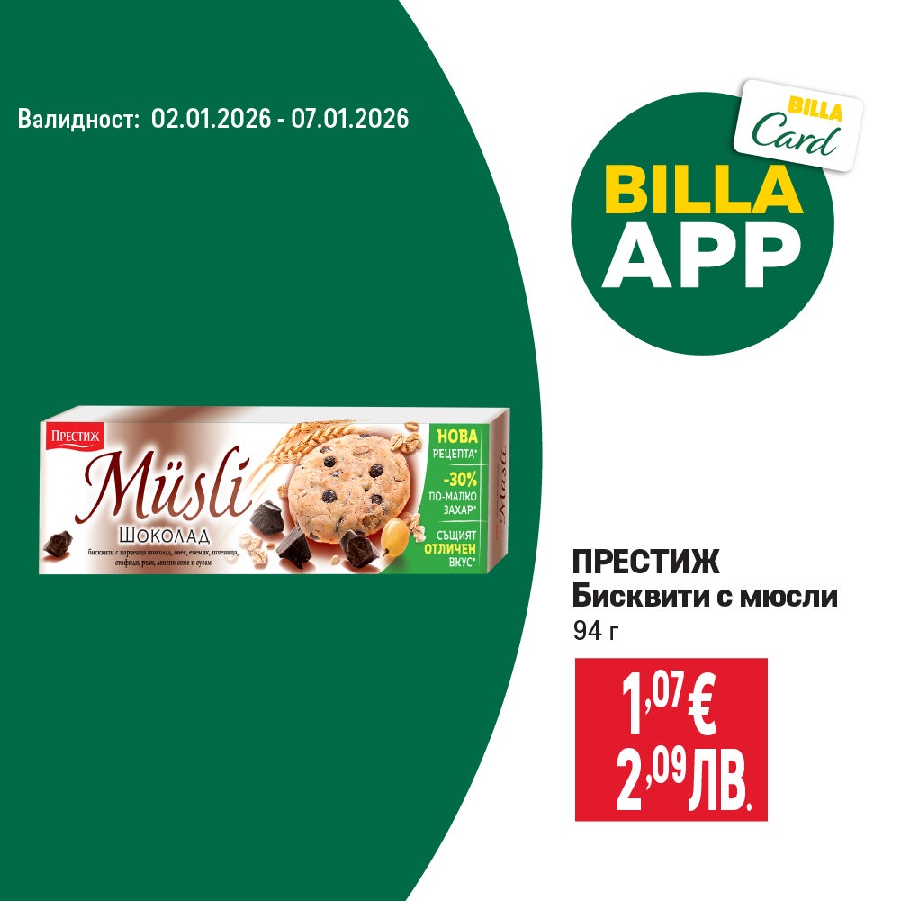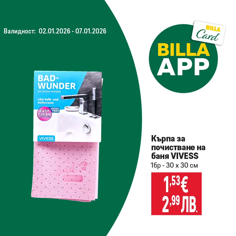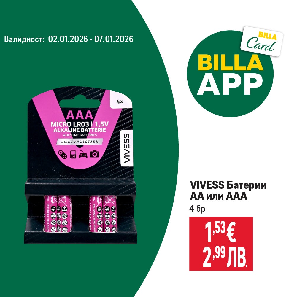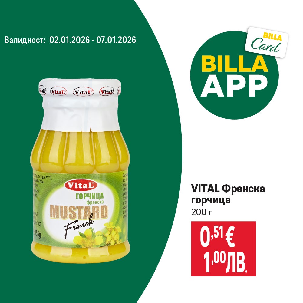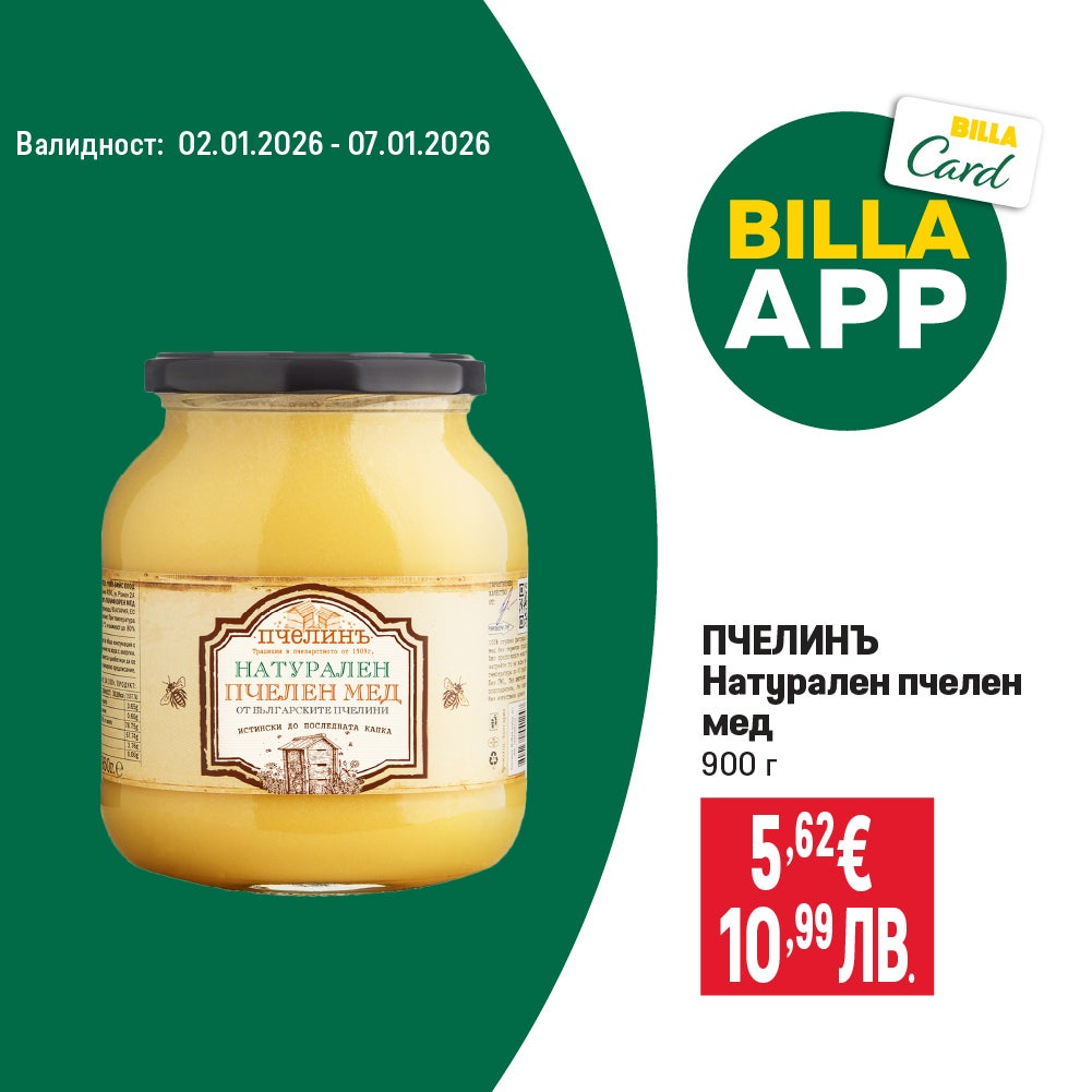 Валидно от 02.01.2026 г. до 07.01.2026 г. ПОСОЧЕНИТЕ ЦЕНИ СА ОБОЗНАЧЕНИ В ЕВРО И ЛЕВА ПО ВАЛУТЕН КУРС 1 € = 1,95583 ЛВ. И СА С ВКЛЮЧЕН ДДС.