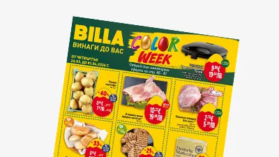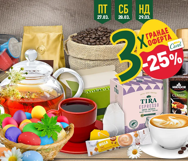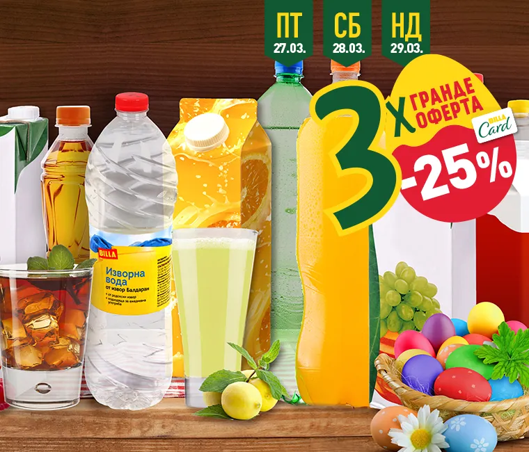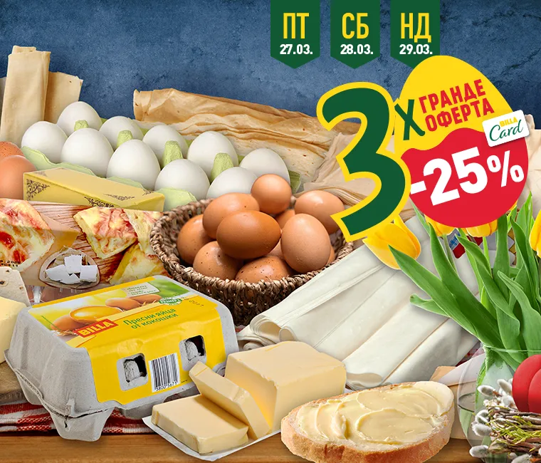 Валидно от 19.03.2026 г. до 25.03.2026 г. Само с BILLA Card. Посочените цени са обозначени в евро и лева по валутен курс 1 € = 1,95583 лв. и са с включен ДДС. Налично в част от магазини BILLA. Виж повече на www.billa.bg.