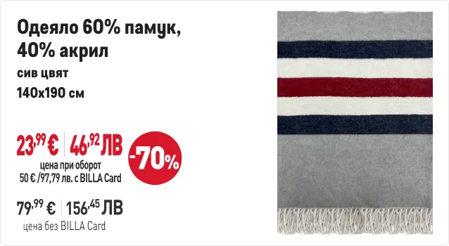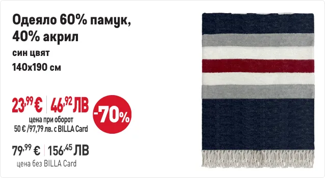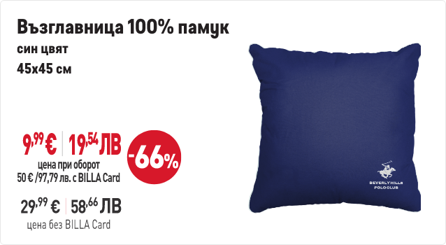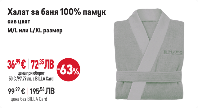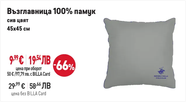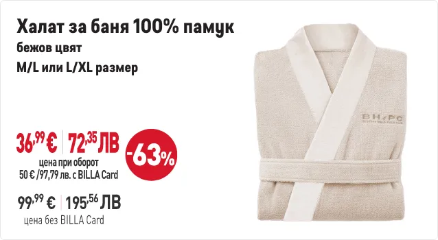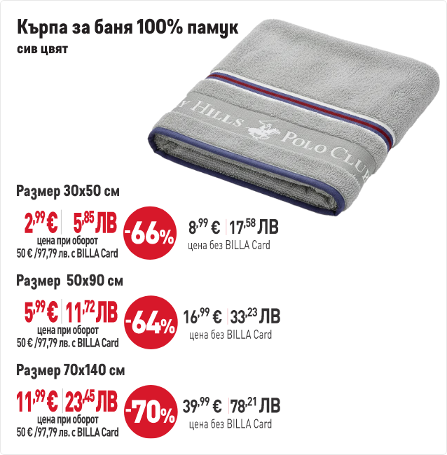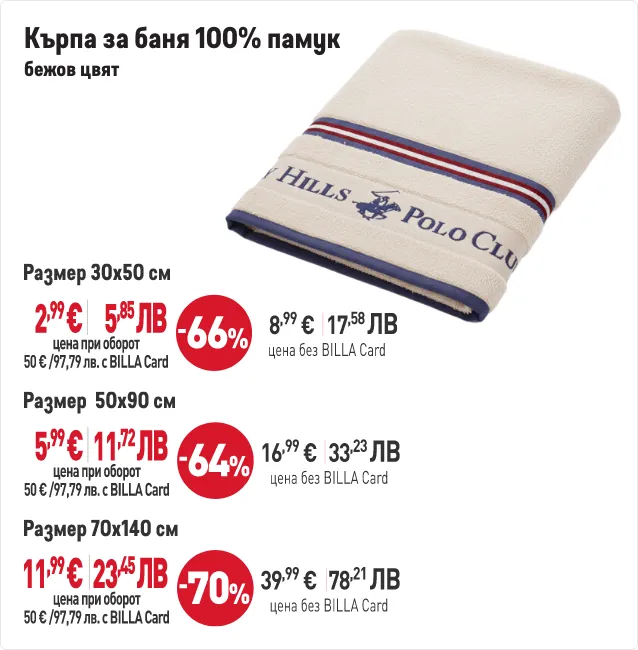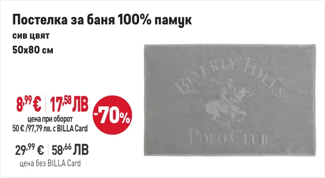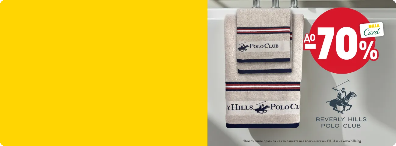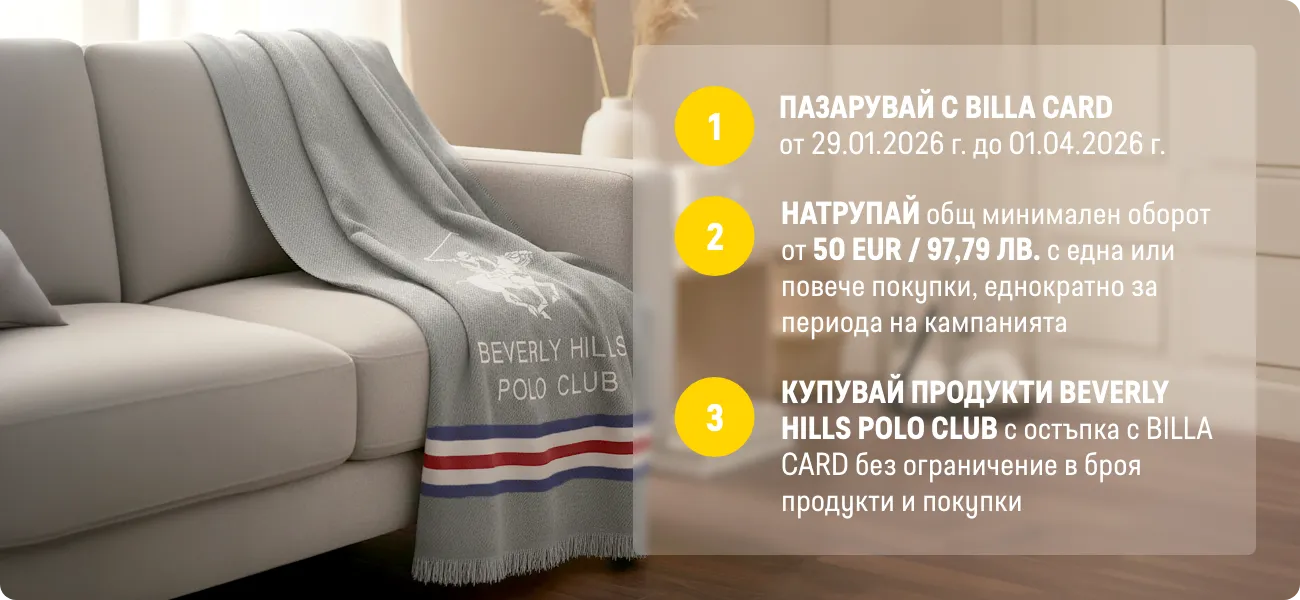 В периода от 29.01.2026 г. до 01.04.2026 г. вкл. всеки притежател на BILLA Card, който достигне обща стойност на покупките с BILLA Card минимум 50 евро/97,79 лв., има право да закупи продукти с търговска марка „BEVERLY HILLS POLO CLUB“ с отстъпка до 70% от продажната цена при следваща покупка с BILLA Card. В общата стойност на покупките не се включва стойността на закупени тютюневи изделия, подаръчни ваучери и храни за кърмачета. Артикулите „BEVERLY HILLS POLO CLUB“ и конкретният размер отстъпка от продажната цена може да видите в рекламните материали за кампанията. Период на кампанията от 29.01.2026 г. до 01.04.2026 г. вкл. или до изчерпване на количествата участващи артикули. Възможно е поради силно увеличено търсене в отделни дни някои от участващите артикули временно да не са налични във всеки магазин BILLA. Виж пълните правила на кампанията във всеки магазин BILLA и на www.billa.bg