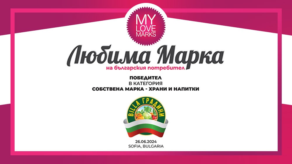 27/06/2024 - BILLA Градини безапелационно спечели първо място в категорията „Собствена марка – храни и напитки“ в надпреварата "Любимите марки" за 2024 г. Над 34 000 души гласуваха в единствената потребителска класация у нас, давайки своята обективна оценка за брандовете, спечелили тяхното доверие. В топ 3 в същата категория влезе и друга собствена марка на търговската верига – Clever.
