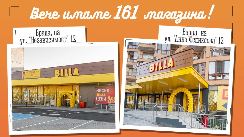 12/09/2024 - В един ден, 12 септември, отворихме два чисто нови BILLA магазина – във Варна и Враца. Така вече имаме 161 филиала в 50 града и сме най-голямата търговска верига по брой на магазините в България.