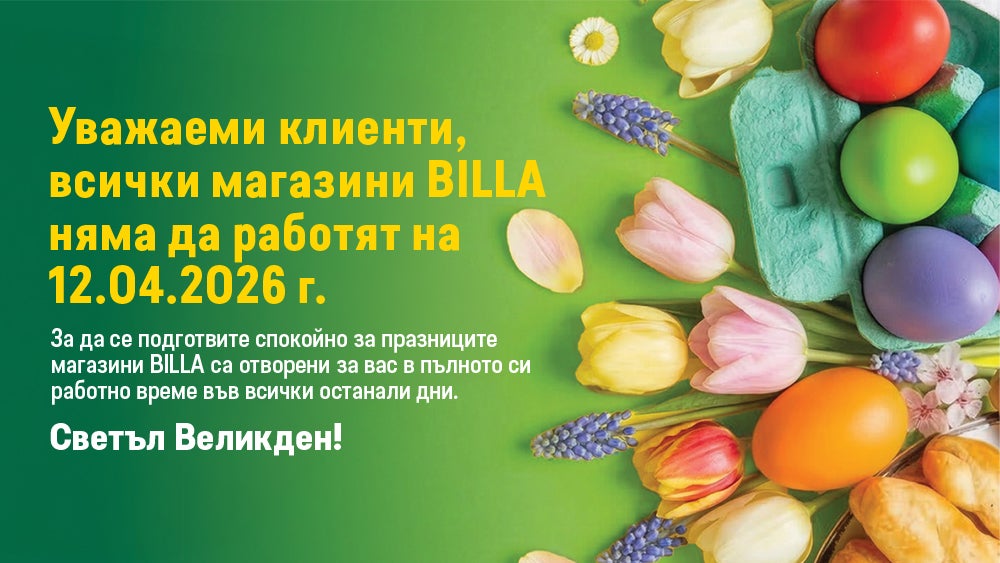 BILLA обяви 12 април 2026 г. – Великден за неработен ден за цялата компания, включително за всички над 170 обекта в страната. Решението отразява стремежа на BILLA да създава условия за добър баланс между работа и личен живот за всички свои служители. В резултат на това над 5 500 души, служители на BILLA в магазините, логистичните бази и администрацията, ще могат да посрещнат празника у дома със своите най-близки хора.