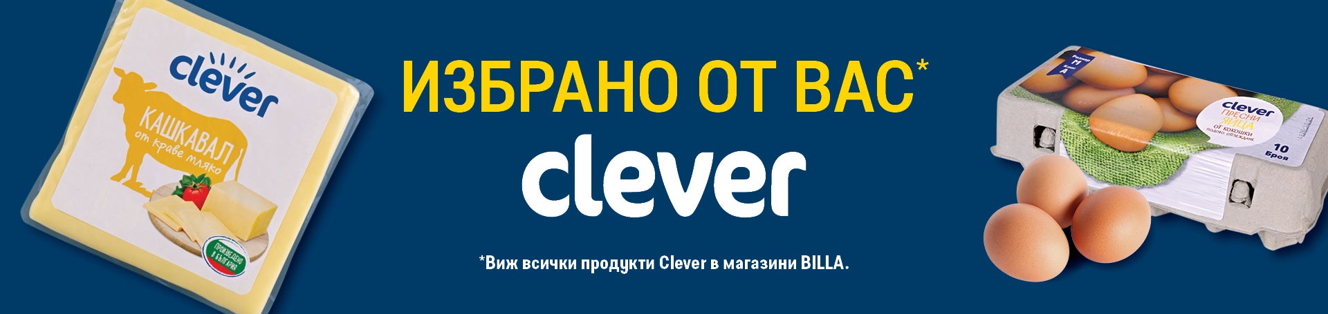 С богат асортимент от над 200 продукта, Clever вече 25 години се грижи за бюджета на стотици български семейства. Под името можеш да откриеш богато разнообразие от предложения - от колбаси, напитки и основни храни, до козметика и нехранителни стоки.