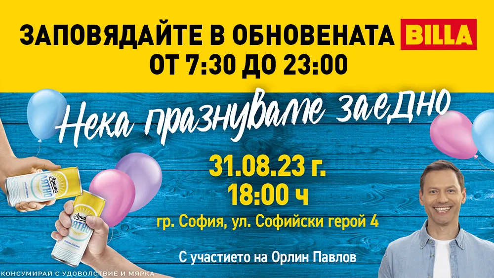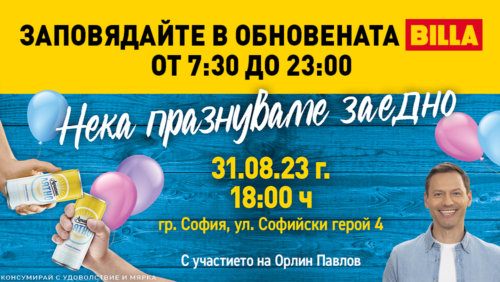 28/08/2023 - Емблематичният магазин BILLA в кв. „Хиподрума“ ще отвори врати на 31 август, след цялостна реконструкция. От 18:00 до 21:00 ч. всички посетители ще имат възможността да се насладят на празнична програма с много музика и танци. Събитието ще започне с любимия аниматор на децата Тоци, който е подготвил забавни игри за малки и големи, точно в 19:00 ч. обичаният актьор и певец Орлин Павлов ще завладее сцената, а вечерта ще завърши с музикален сет от DJ Стоян Стоянов. Всички посетители ще могат да се освежат с леденостудена напитка и да участват на място в специална томбола за кулинарни принадлежности и барбекю на въглища, които ще се раздават на всеки кръгъл час.