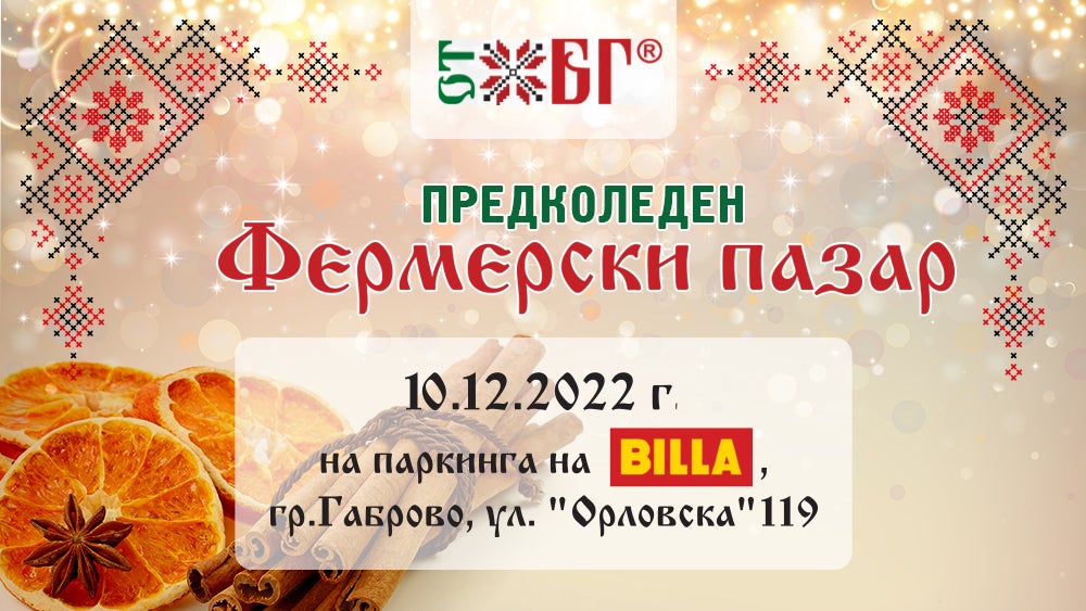 06/12/2022 - На 10-ти декември, BILLA ще бъде домакин на последния за 2022 г. декемврийски Фермерски пазар „ОТ БГ“ в Габрово. По обичай, събитието ще се проведе на паркинга пред магазина на веригата, разположен на ул. „Орловска“ 119. Производители и занаятчии от региона на Габрово, Плевен, Ловеч, Велико Търново, Стара Загора и Казанлък ще предложат богато разнообразие от традиционни български продукти, които да допринесат за уюта у дома и отличния вкус на семейната трапеза. В допълнение към тях, предпразничното издание на събитието ще предложи и алтернативни предложения от украинската, белоруската, молдовската и прибалтийската кухня.