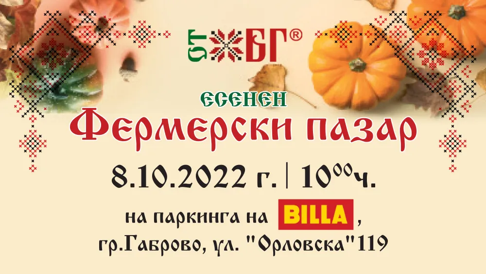 05/10/2022 - По повод настъпването на есента, на 8 октомври 2022 г. BILLA ще бъде домакин на поредното издание на традиционния Фермерски пазар „ОТ БГ“ в Габрово. Събитието ще се проведе от 10:00 до 17:00 часа, на паркинга на магазина на веригата, разположен на ул. „Орловска“ №119, в близост до спортна зала "Орловец". Земеделски производители, занаятчии, фермери и майстори на храни, напитки и козметика с изцяло български произход ще зарадват посетителите с изобилие от сезонни плодове и зеленчуци, разнообразни деликатеси и празнични изделия. Един от всички присъстващи ще има възможността да спечели торба за многократна употреба, пълна със селектирани фермерски продукти. За всички останали, организаторите са предвидили вкусни рецепти с кестени за здравето и уютната трапеза у дома.