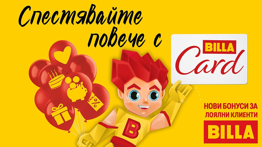 С помощта на супергероя на отстъпките Билли, колкото повече клиентите пазаруват в BILLA, толкова повече бонус ваучери печелят. За натрупани поне 100 лв. на месец, притежателите на BILLA Card получават 1 лв. отстъпка при следващо пазаруване. За похарчени поне 200 лв. на месец – Билли възнаграждава с ваучер за покупка на един от няколко предварително определени от BILLA продукта само за 0,01 лв. Най-активните лоялни клиенти, реализирали покупки за минимум 300 лв. или 500 лв., печелят съответно ваучер за 5% и за 10% отстъпка при следваща покупка от BILLA.