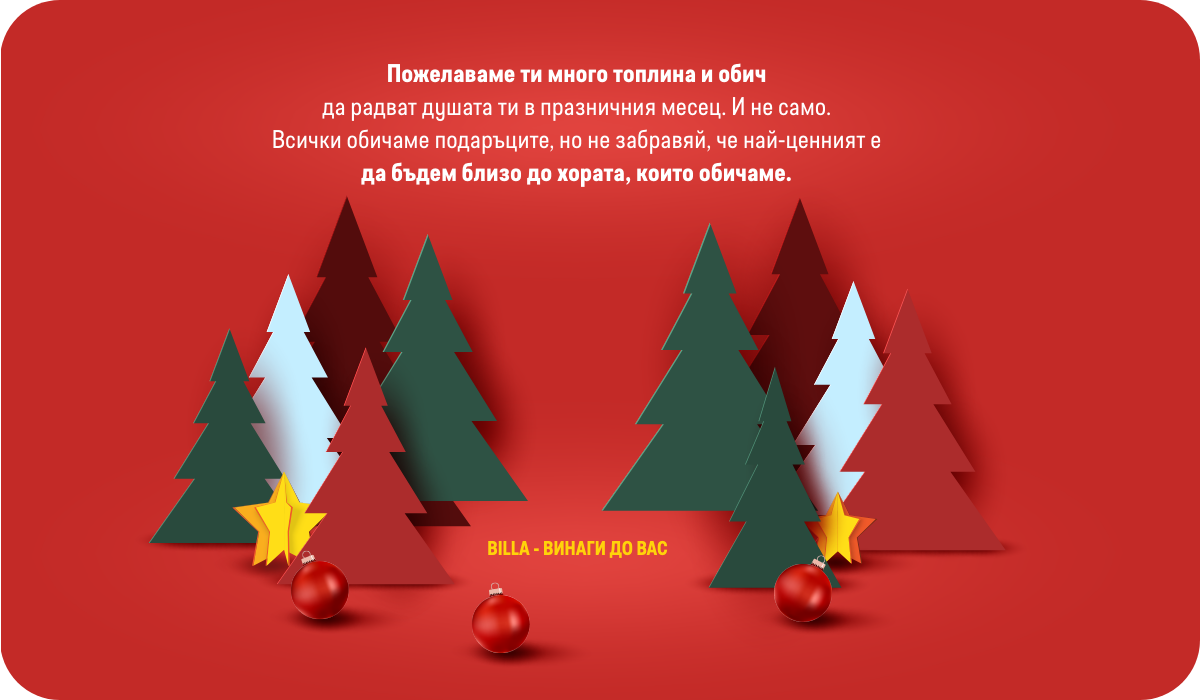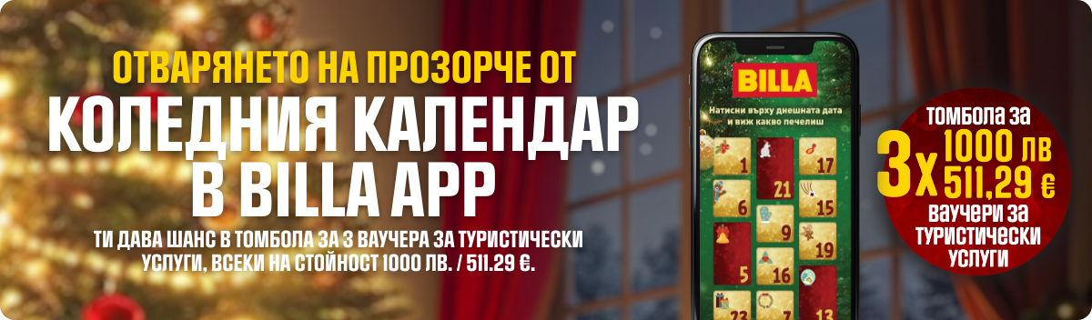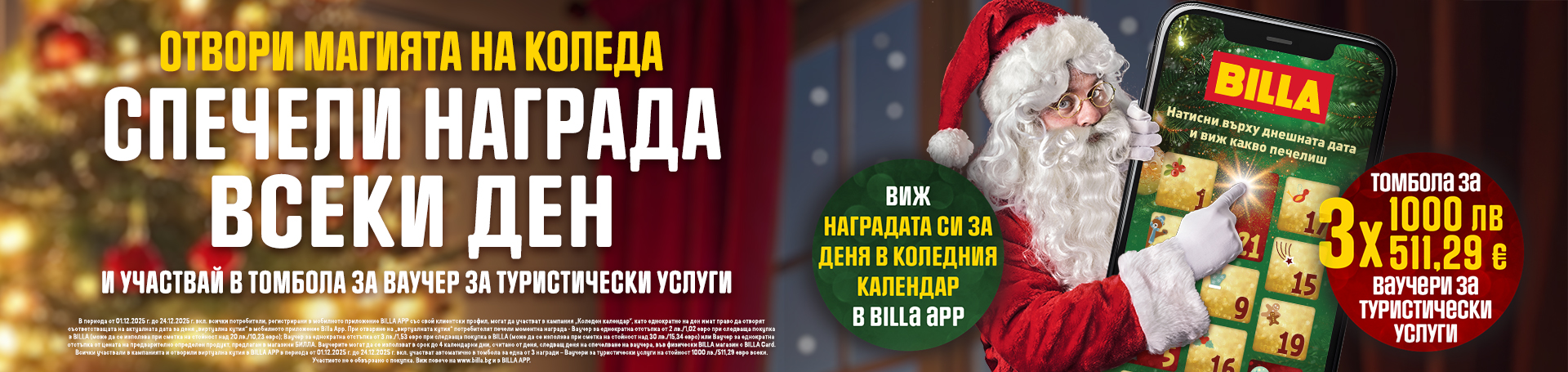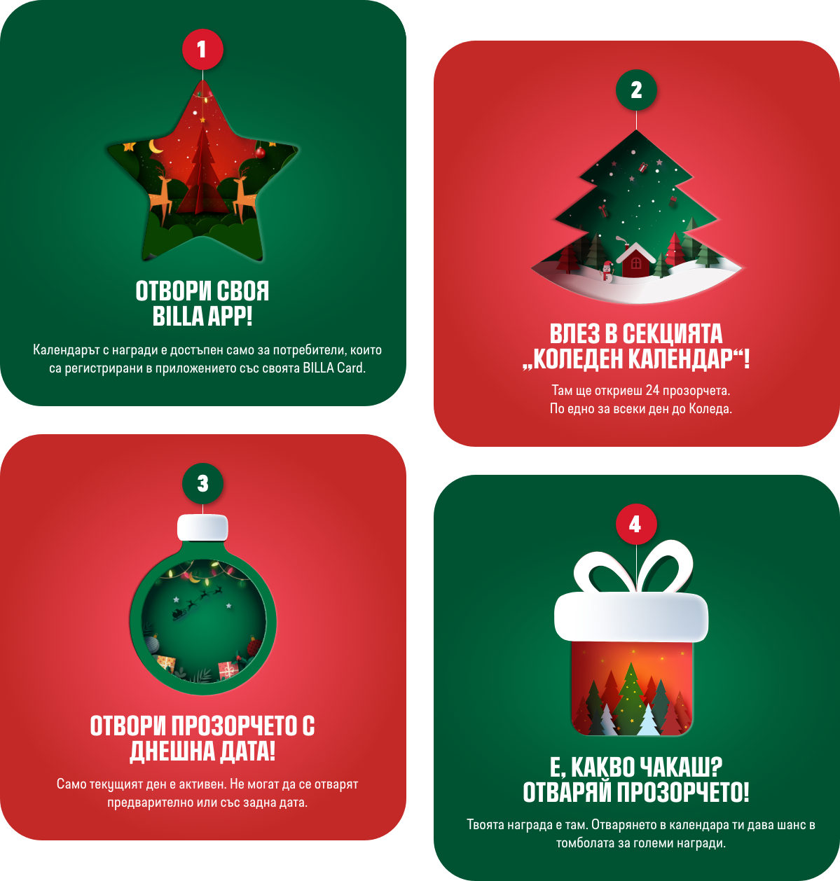До Коледа всеки ден имаш възможност да отвориш прозорче от нашия коледен календар и да вземеш подарък от нас! Само трябва да си свалил BILLA App, който през цялата година радва с отстъпки и томболи за различни награди. Също да си регистриран в приложението или да се регистрираш сега. От 1 до 24 декември - не пропускай нито една възможност да спечелиш!