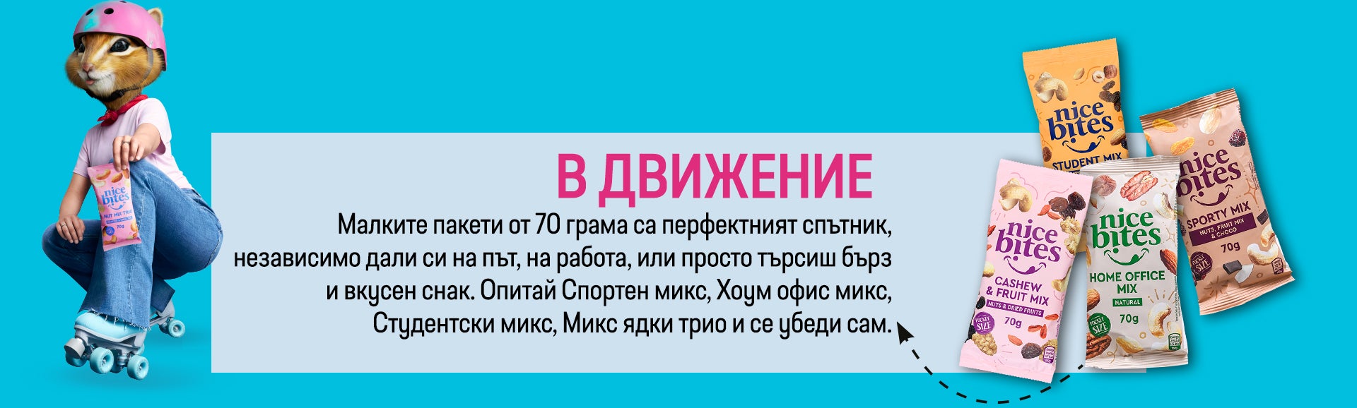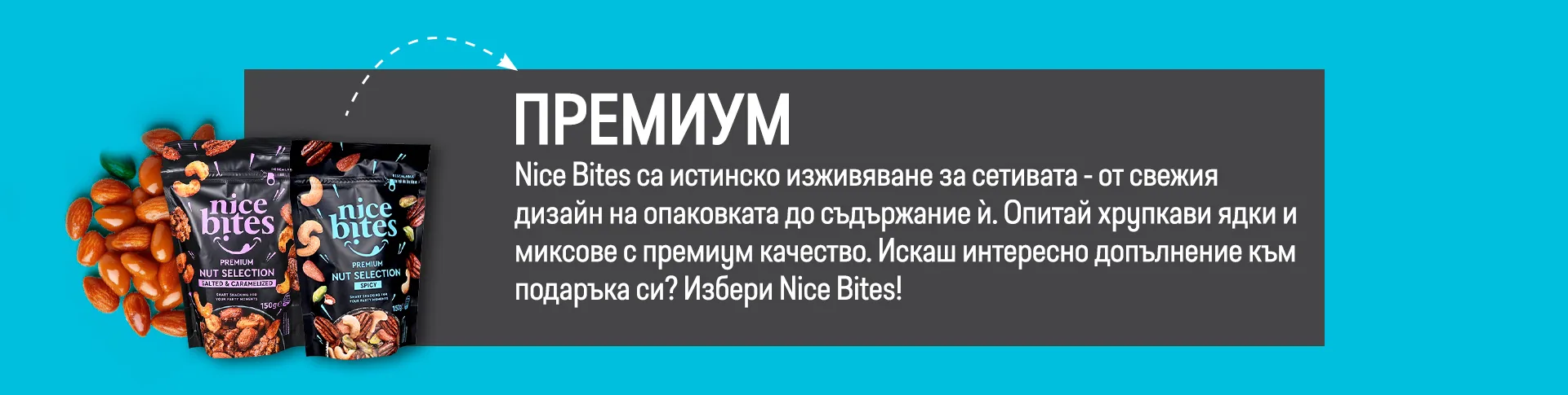 И Nice Bites е доказателството! Това е собсвената ни марка от разнообразни видове ядки, сушени плодове и техните неочаквани комбинации. А сега и с още една причина да ги обичаш – Nice Bites е „Избран продукт на годината“ за 2025, заради качеството и вкуса, които не остават незабелязани!