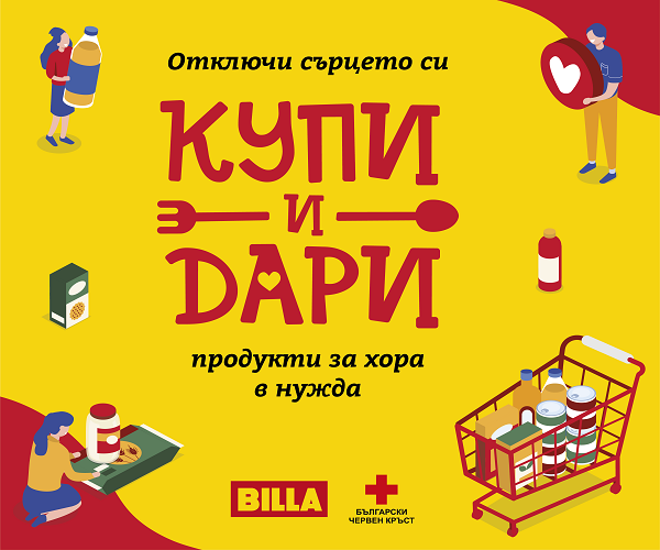 В контекста на проекта „Купи и Дари“, в магазините на BILLA в цялата страна е разположена брандирана количка за дарение на хранителни продукти. Kлиентите на търговската верига могат да подкрепят инициативата, като закупуват и даряват продукти от първа необходимост – брашно, варива, макаронени изделия, захар и захарни изделия, олио, зеленчукови и месни консерви. Компанията поема ангажимент веднъж месечно да добавя хранителни продукти към събраните дарения във всеки свой обект, а БЧК разпределя количествата спрямо потребностите на индивидуалните и институционални бенефициенти.