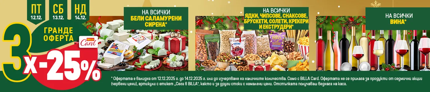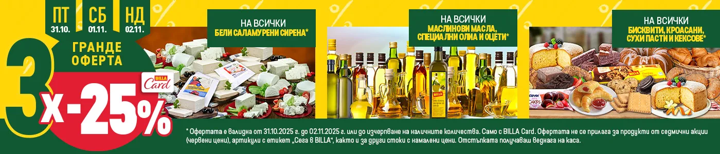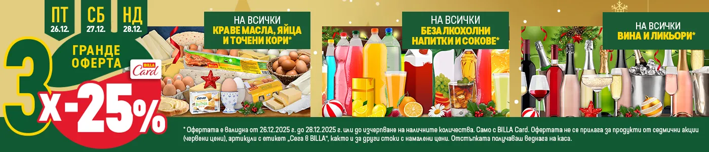 Когато имате BILLA Card, пазарувате от вашия магазин BILLA с отстъпки – една от които е и нашата ГРАНДЕ ОФЕРТА, която ви дава 25% намаление на група продукти в дните петък-неделя.