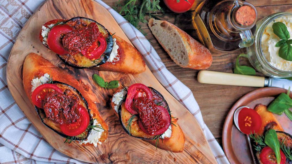 Намазват се с крем сирене, върху него се слага патладжан и малко копър, и се завършва със сушен домат. Брускетите се поднасят веднага.