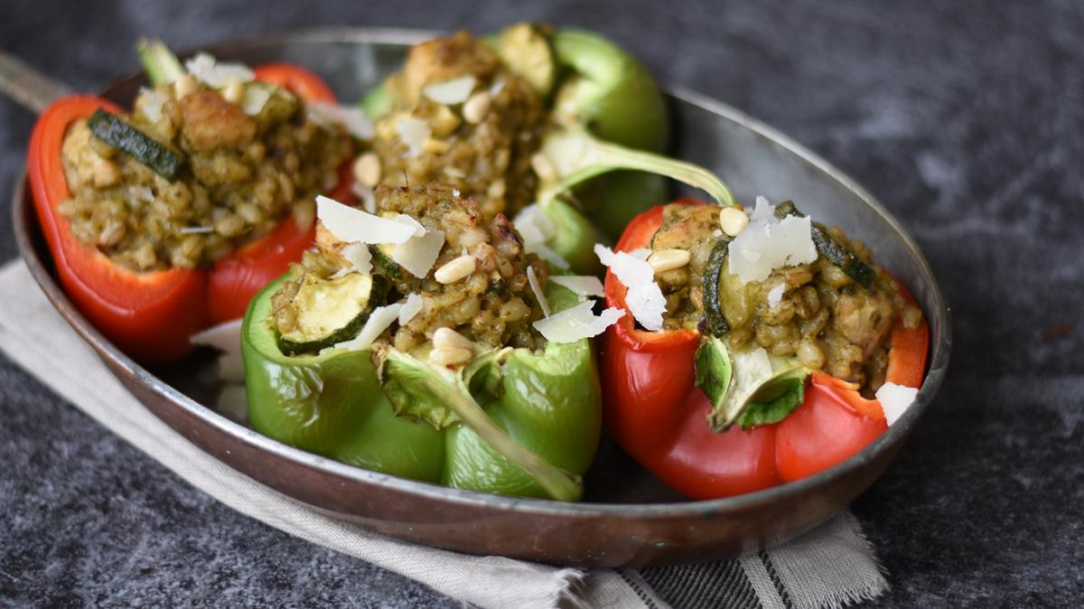 Чушките се пълнят със сместа и се поръсват с пармезан. Ястието се пече 20 минути на 180 °С. Гарнира се с настърган пармезан и кедрови ядки.
