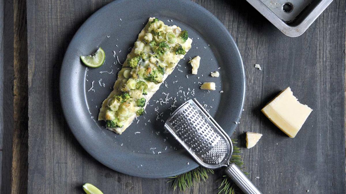 Броколите и карфиолът се разпределят върху рибните филета заедно с нарязания на шайби праз и се поливат със сметановия сос. Поръсва се с настърганото сирене „Грана падано“.