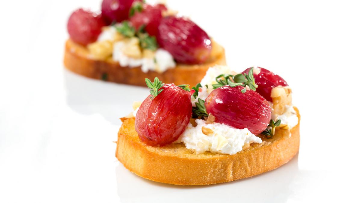 Орехите се накълцват. Главата чесън се разрязва на две напречно. Запечените филийки се натриват с чесъна и се поръсват с останалото маслиново масло. Отгоре се подреждат натрошеното сирене, гроздето и нарязаните орехи. Полива се с малко мед и се сервират топли.