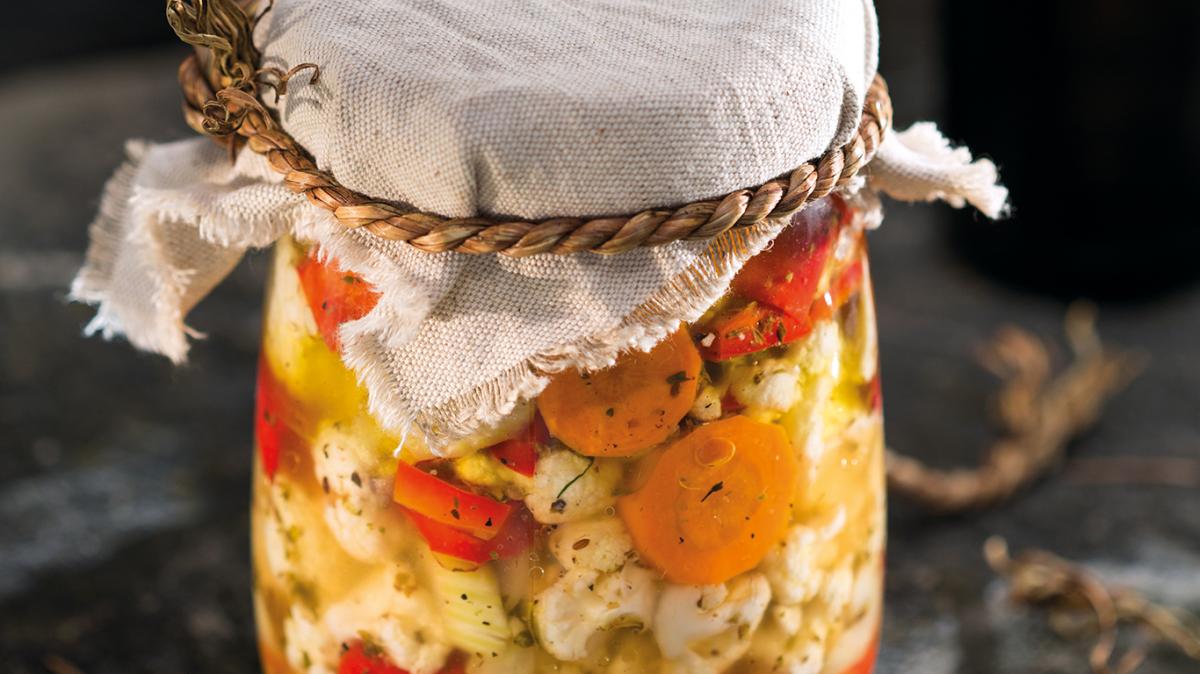 Зеленчуците се слагат в буркана и се заливат с маринатата. Затваря се и се оставя в хладилник. Трябва да престои няколко дни преди сервиране.