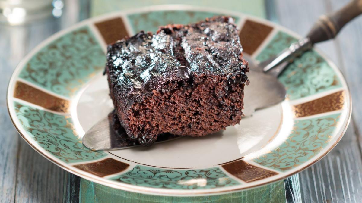 Водата, останалата захар и останалото какао се сипват в съд и се поставят на котлона. Щом сместа кипне, се готви, докато се получи еднородна смес – около 2 минути. Тестото се залива с какаовата смес.