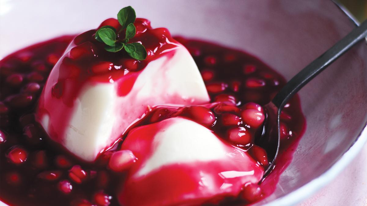 Сокът се вари с останалата захарта, докато се редуцира наполовина. Охлажда се и се полива върху стегнатата панакота. Десертът се декорира със зрънца от нар.