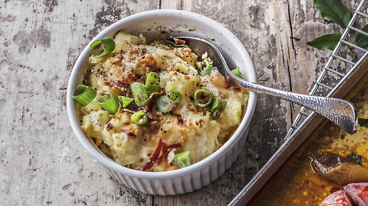 Сместа се разбърква добре и се слага в керамичен съд за печене. Отгоре се поръсва останалото настъргано сирене „Гауда“, нарязания пресен лук и бекона, накъсан на парченца.