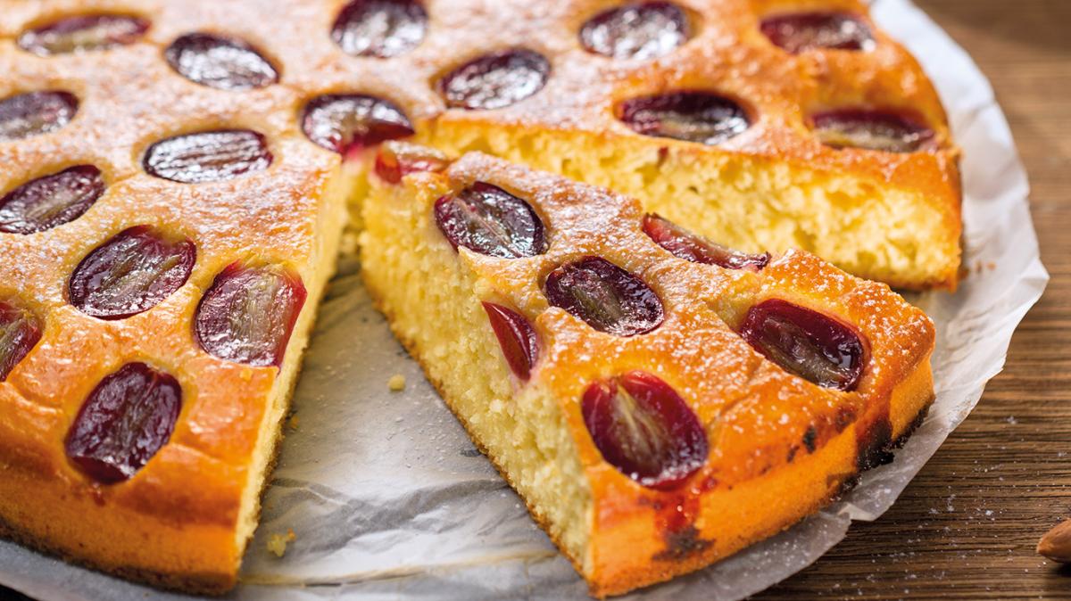 1accessibility.recipes.cookingstepПоловината от киселото мляко се смесва с маслиновото масло, яйцата, сока и настърганата кора от лимона и се разбива до хомогенизиране.2accessibility.recipes.cookingstepДобавят се захарта, брашното, бакпулверът, солта и смлените бадеми и отново се разбива.3accessibility.recipes.cookingstepСместа се изсипва в съд за печене с незалепващо покритие и отгоре се подреждат разполовените зърна грозде.4accessibility.recipes.cookingstepКейкът се пече 35 минути на 170 °С. Сервира се с останалото кисело мляко, разбъркано с меда.