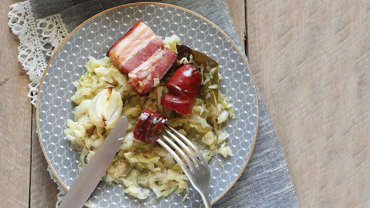 1accessibility.recipes.cookingstepБеконът се нарязва на тънко, а наденицата на едро.2accessibility.recipes.cookingstepЗапържват се за кратко в сгорещеното олио, изваждат се от него и се оставят настрана.3accessibility.recipes.cookingstepВ същата мазнина до златисто се запържва 1 глава лук, нарязана наситно. 4accessibility.recipes.cookingstepПрибавят се киселото зеле, дафиновият лист, сол, черен пипер и лютата чушка.5accessibility.recipes.cookingstepЗапържва се, сипва се малко вода, задушава се за 15 минути и се прехвърля в огнеупорен съд.6accessibility.recipes.cookingstepВърху киселото зеле се слагат надениците, беконът и другата глава лук, нарязана на четвъртини.7accessibility.recipes.cookingstepПече се 15 минути в загрята на 180°С фурна. Ястието се сервира топло.