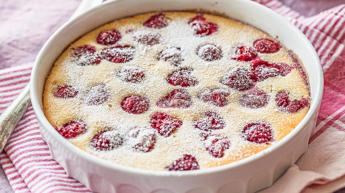Тестото се сипва във формата с малините и се слага в предварително загрята фурна.