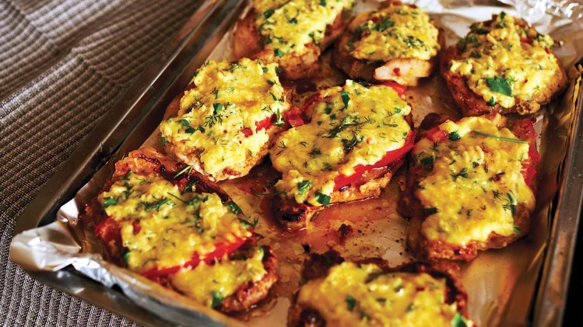 1accessibility.recipes.cookingstepКотлетите се начукват и се поръсват със сол и черен пипер.2accessibility.recipes.cookingstepЗапържват се в загрятата мазнина и се поставят в тава, покрита с алуминиево фолио.3accessibility.recipes.cookingstepДоматите се режат на филийки и се подреждат върху котлетите.4accessibility.recipes.cookingstepЯйцата се разбиват и към тях се добавят сол, черен пипер, наситненият чесън, магданозът, копърът и кашкавалът.5accessibility.recipes.cookingstepДоматите се заливат със сместа и ястието се пече в загрята на 200°С фурна, колкото да се разтопи сиренето, но да не се препече.6accessibility.recipes.cookingstepСервира се, докато е топло, със свежа салата по избор.