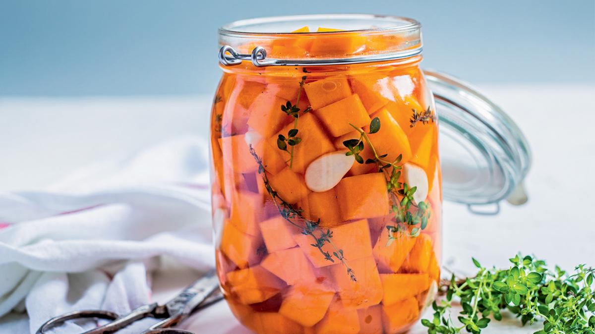 Тиквата се слага в стерилизирани буркани, залива се с течността, слагат се билките и нарязаният чесън и бурканите се затварят. Съхранява се в хладилник до един месец. От това количество се пълнят 1 - 2 буркана.
