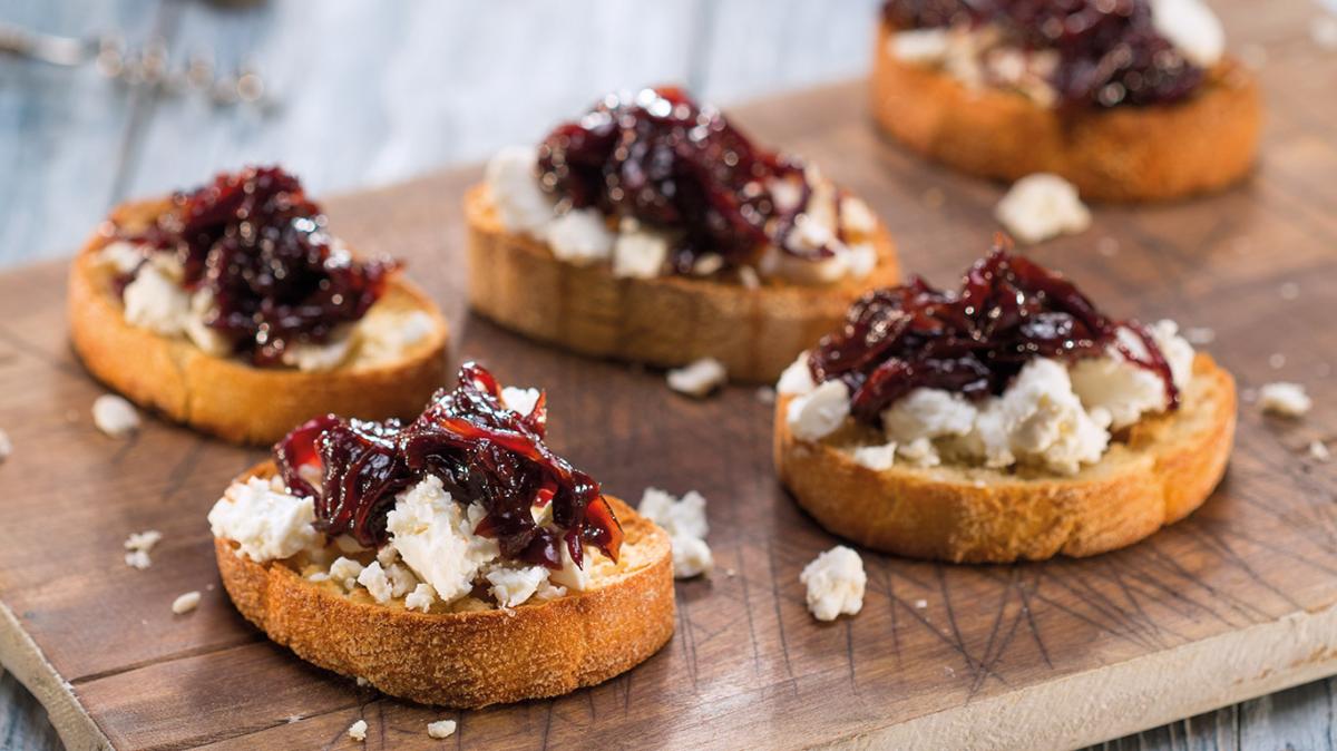 Багетата се нарязва на филии и се препича. Върху всяко парче хляб се слага малко сирене и отгоре се разпределя мармаладът. Най-подходящото червено вино за тази рецепта е десертното.