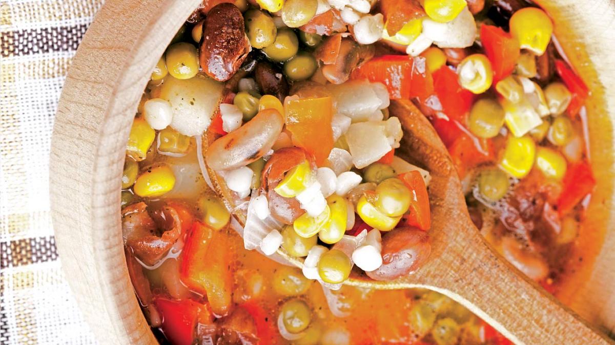 Прибавят се отцедените и изплакнати боб, царевица и грах, и ястието се готви още 2 минути.