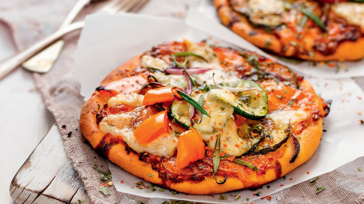 Блатовете се намазват с доматен сос, нареждат се тиквичките, чушките и отгоре – моцарела. Пекат се около 15 минути в загрята на 200 °С фурна.