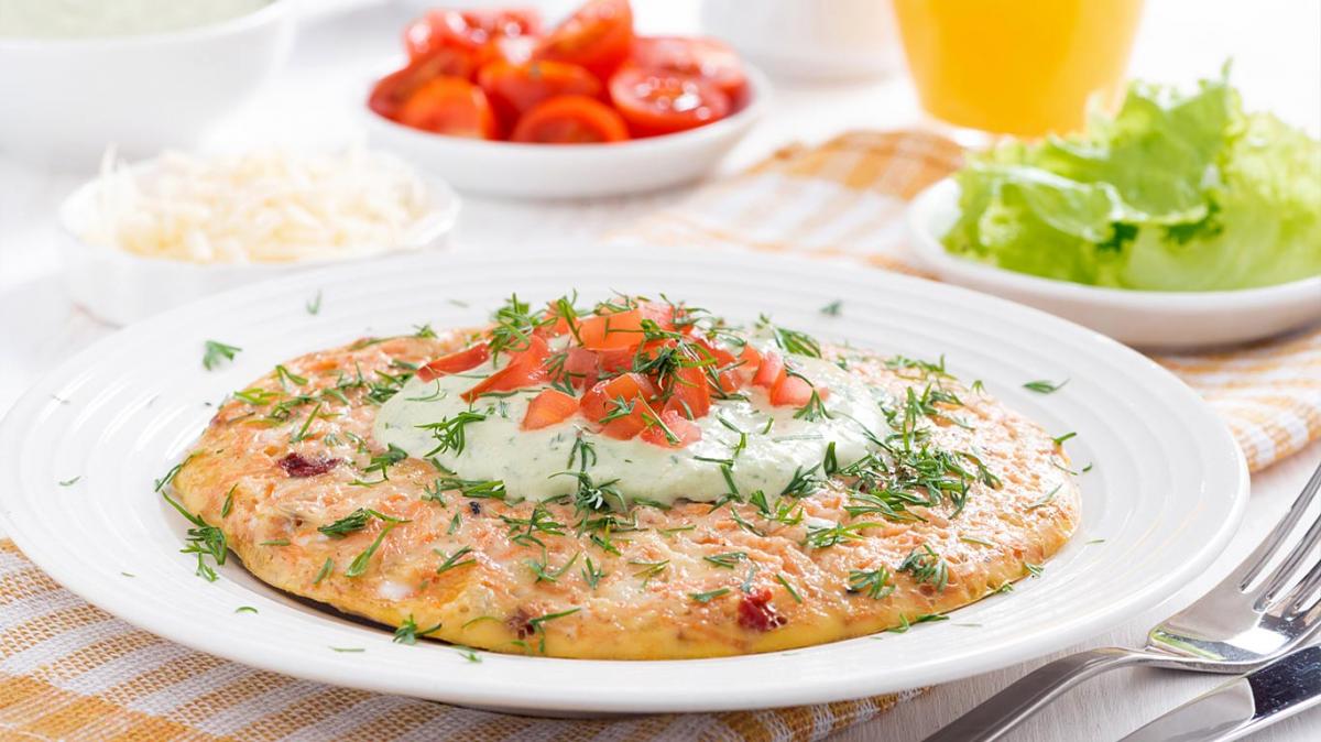 Омлетът се приплъзва в подходяща чиния и отгоре се разпределя киселото мляко, аранжира се с кубчетата домати. Поръсва се с копъра и се сервира.