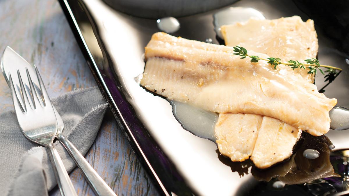 Лукът се наситнява и заедно с другия дафинов лист, 2 стръка мащерка и 1/4 ч. л. бял пипер се готвят във виното, докато омекне и се редуцира наполовина. Налива се велутето. Пасира се и се прецежда. Добавят се останалото масло и лимоновият сок. Рибата се овкусява със сол и черен пипер. Готви се на плоча, намазана с маслиново масло. Поднася се със соса.