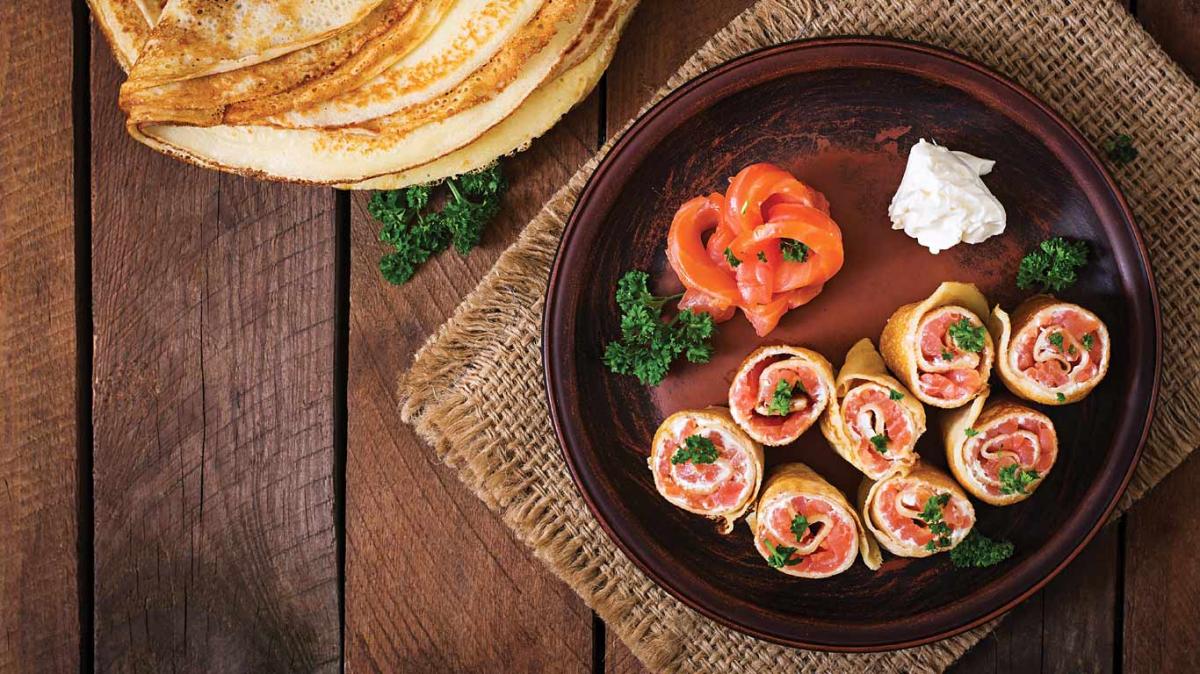 Всяка палачинка се намазва с малко от плънката и отгоре се слага по едно филе от сьомга.