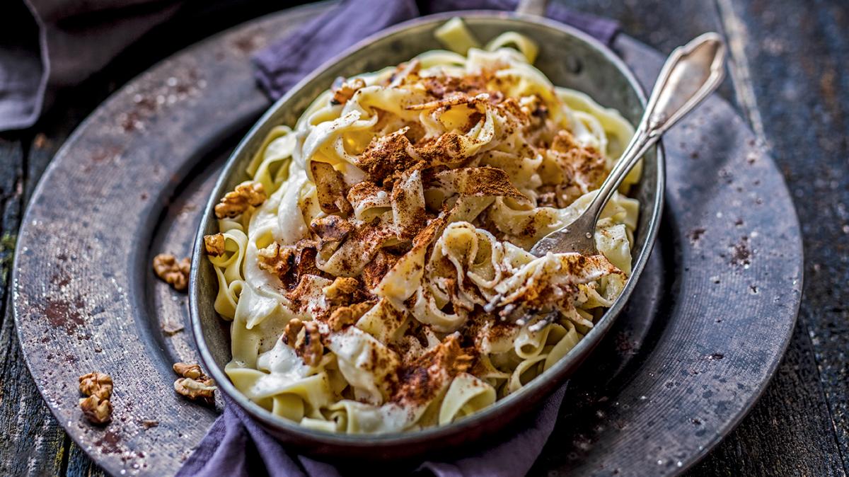 Сместа се разбърква с телена бъркалка, докато сиренето придобие кремообразна текстура. Пастата се отцежда от водата, добавя се приготвеното сирене, хрупкавият чесън, малко канела, и всичко се смесва. Преди сервиране пастата се гарнира щедро с останалия пармезан, орехите и канелата.