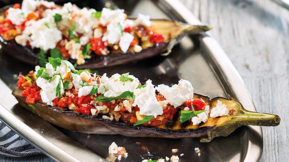 Върху всяка половинка патладжан се слага от соса. Поръсва се с натрошено сирене, орехи и наситнен магданоз.