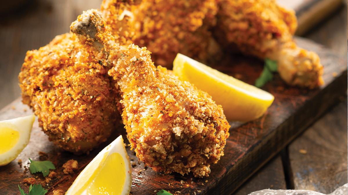 Яйцата се разбиват. Бутчетата се овалват първо в брашно, после в яйцата и накрая в ароматните трохи. Подреждат се в тава с незалепващо покритие и се поливат с маслиново масло. Фурната се загрява на 200 °С с вентилатор. Бутчетата се пекат за 20 минути. Поднасят се с магданоз и резени лимон.