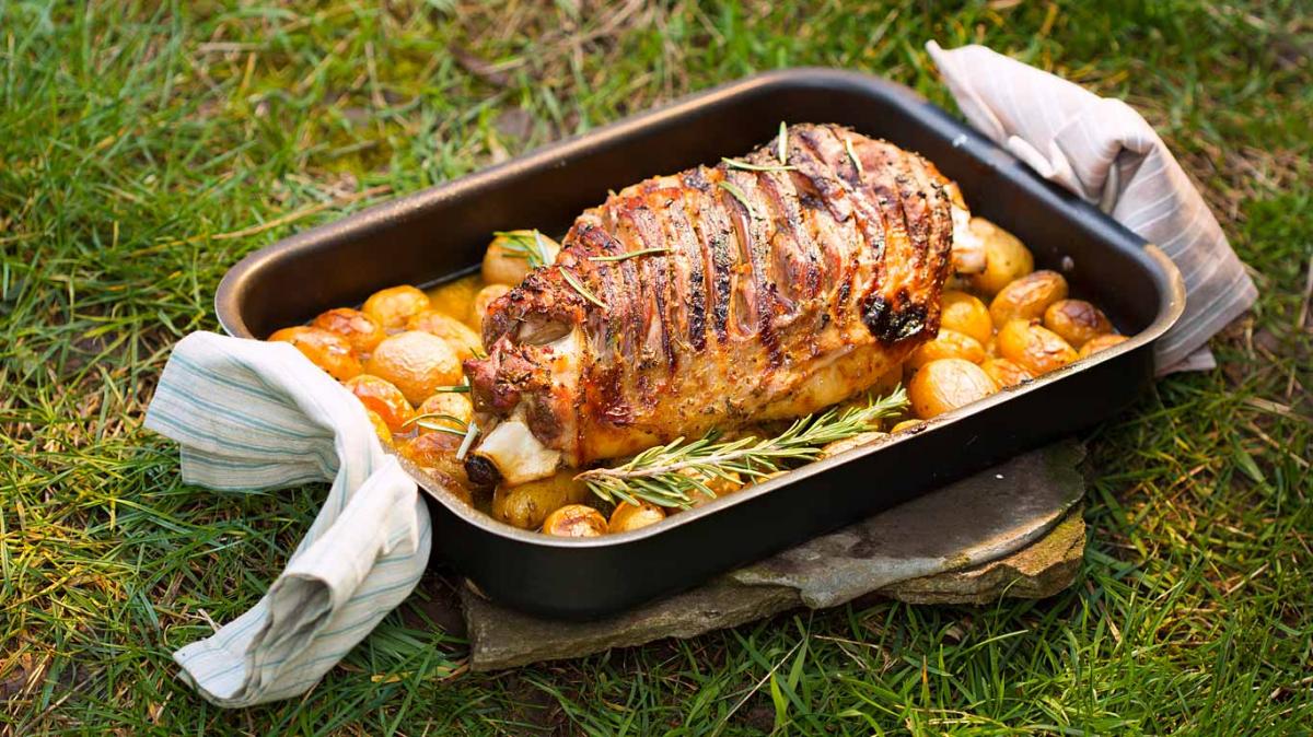 Агнешкото се намазва добре от всички страни с ароматната смес, наливат се 150 мл вода и се слагат останалите клонки розмарин. Ястието се пече в загрята на 160ºC фурна за 2 часа.