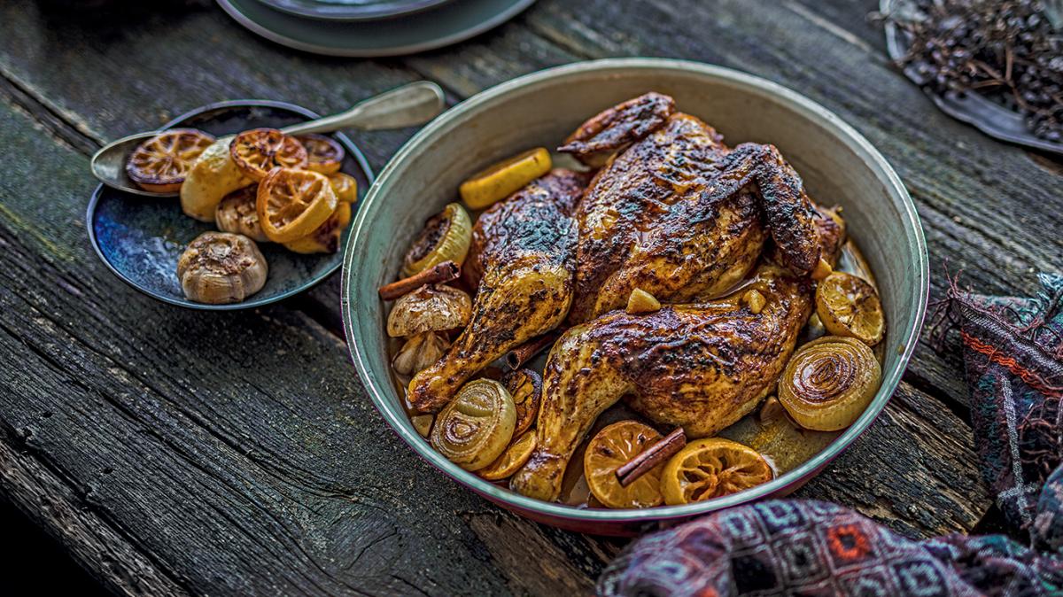 Пилето се разрязва през гръбнака (така че да се разтвори) и се овкусява със сол и канела.