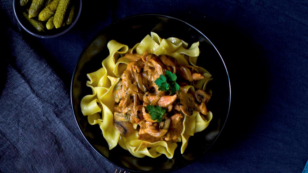 Месото се връща в тигана, сипва се сметаната, добавят се ситно нарязаните краставички и се готви още 2–3 минути на слаб огън, като се разбърква непрекъснато.