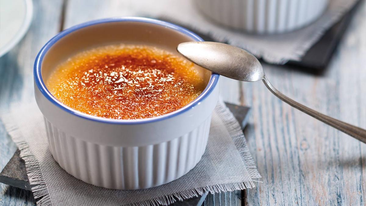 Сместа се налива в купички за крем брюле и се оставя в хладилник за 2 часа.