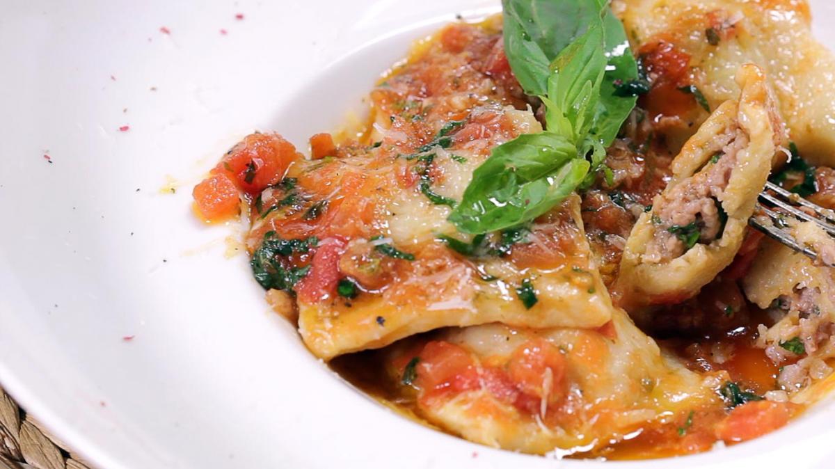 Тестото се разточва на тънка кора и от него се изрязват равиоли с различни форми. Най-лесният начин е тестото да се нареже на ивици и по 1 ч. л. от плънката да се разпредели върху тях на разстояние от 2 см, след което тестото се прегъва така, че да покрие плънката. За направата на кръгли форми или полумесеци се използва чаша, като краищата се притискат с вилица.