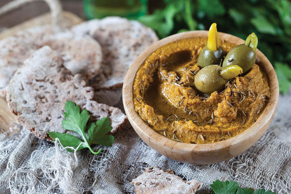 Разядката се поднася в купа, поръсена с лимоновия сок и кимиона и украсена със заделените маслини и шамфъстъци. Към тази разядка поднесете препечен хляб, намазан с маслиново масло и поръсен с черен пипер.