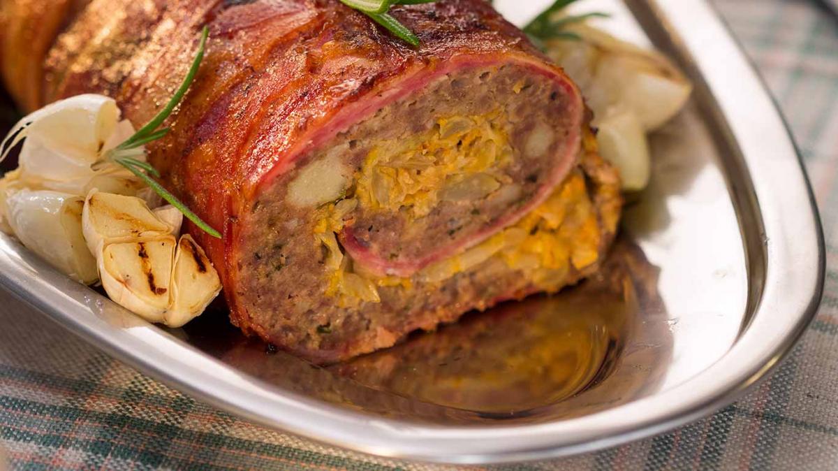 Върху намокрен лист пергаментова хартия се подреждат лентичките бекон, а отгоре равномерно се разстила каймата. Върху нея се поставя сместа със зелето, като се заглажда добре.