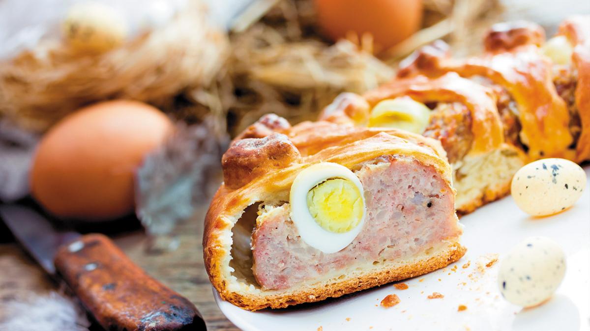 Тестото се разточва и се прехвърля в намазнена кръгла форма за печене с дупка в средата, така че краищата му да висят извън ръба на формата. Отгоре се слага оформеното руло, а сварените яйца се притискат върху него.