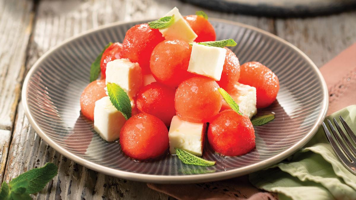 1accessibility.recipes.cookingstepДинята се бели и се почиства от семките.2accessibility.recipes.cookingstepС помощта на лъжица за сладолед от нея се оформят топчета. Сиренето се нарязва на кубчета, които се подреждат в чиния с динята и листенцата мента.3accessibility.recipes.cookingstepМедът се разбива със сока от лайм и сол на вкус. Салатата се овкусява с дресинга и се сервира.
