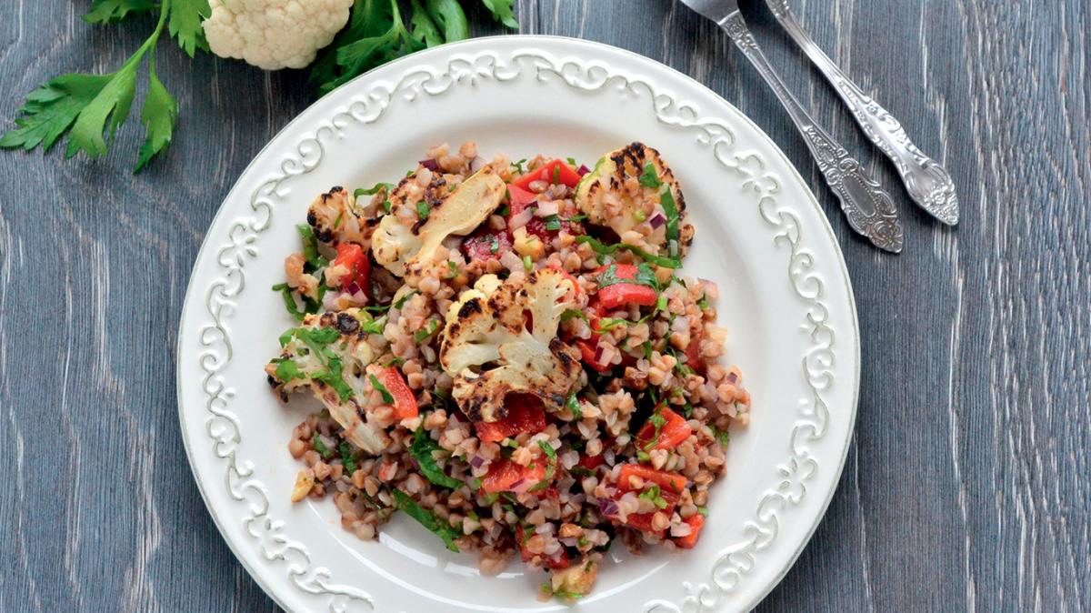 Всичко се разбърква внимателно и се разпределя в чинии. Отгоре се слага карфиол. Салатата се сервира с резенче лимон.