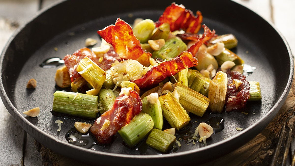 Празът се подрежда в чиния, поръсва се с накълцаните ядки, бекона и със соса от тигана.
