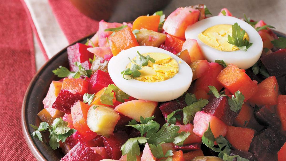 Яйцата се сваряват за 12 минути, обелват се и се оставят настрана. В подходяща тава, покрита с хартия за печене, се слагат измитите и необелени картофи, цвекло и моркови.