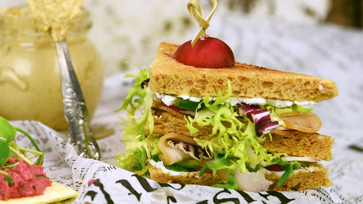 Същото се прави с останалите продукти, като последната филия се слага с намазаната със сирене страна надолу. Слагат се клечки за зъби в срещуположните краища на сандвича и се разрязва по диагонал. Поднасят се веднага.